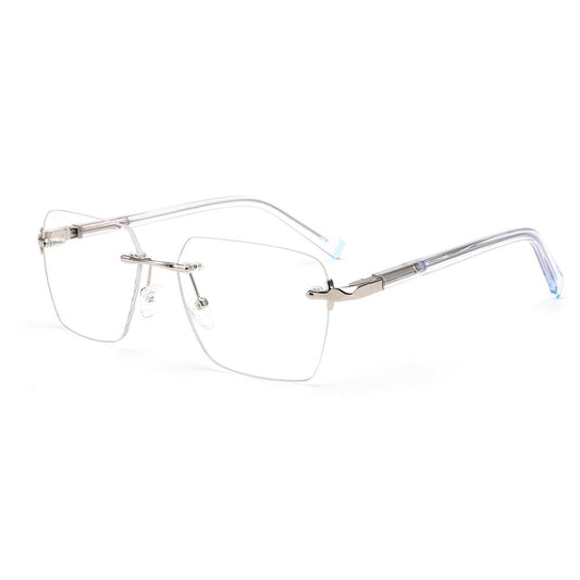 These stylish glasses showcase a sleek silver frame with MCROONS sharp, defined edges, offering a modern and sophisticated look. The dark gray temples provide a comfortable fit and contrast nicely with the transparent lenses, making them suitable for both casual and formal occasions. Ideal for both men and women, these glasses are perfect for anyone looking to make a fashion statement while enjoying clarity in vision.