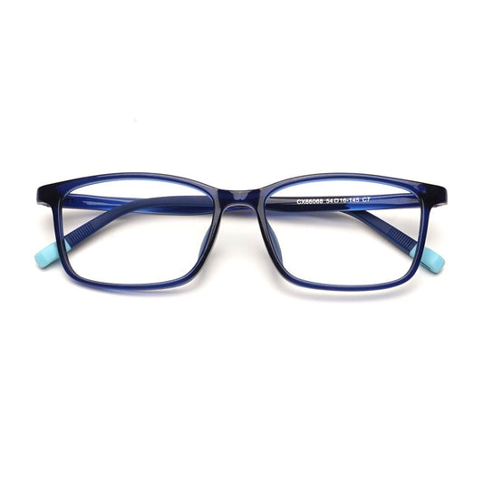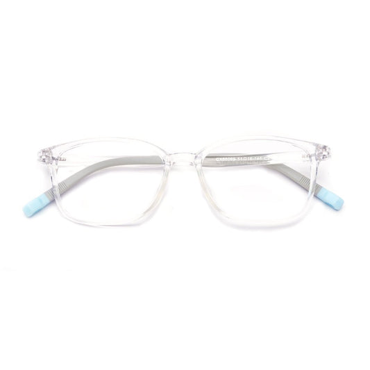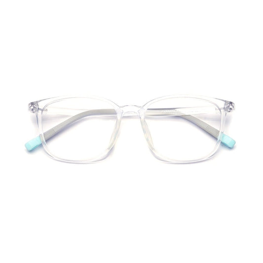 MCROONS eYeglasses showcase a stYlish rectangular design with a transparent frame complemented By medium blue temples and light blue tips. Lightweight and trendY, theY are suitable for everYdaY wear and can be customized with clear or prescription lenses. A fresh addition to anY eYewear collection.