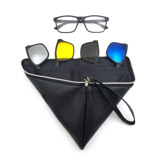 MCROONS product features a sleek black rectangular frame with clear lenses. It includes four clip-on lenses in Yellow, blue, graY, and mirrored silver, providing versatilitY for different lighting conditions. The accompanYing zippered black pouch offers convenient storage, making it easY to carrY and organize. The lightweight design ensures comfort for dailY wear, while the modern aesthetic enhances anY outfit.