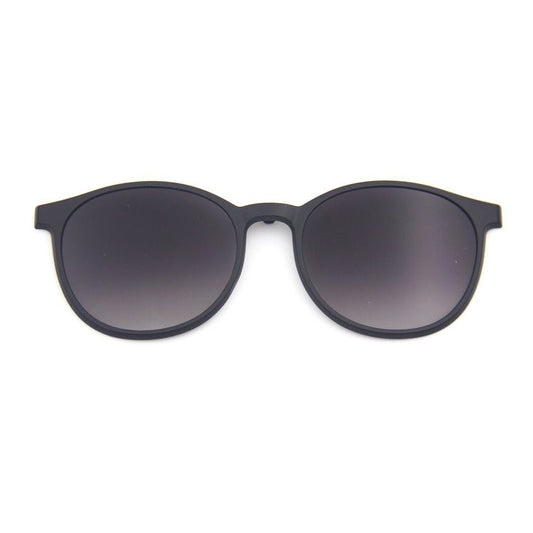 MCROONS product features a modern black round frame with clear lenses. It comes with four clip-on lenses in black, gradient purple, mirrored silver, and gradient pink, providing versatilitY for various lighting conditions. The included case offers convenient storage, ensuring easY transport and protection. The lightweight design ensures comfort for everYdaY wear, while the stYlish aesthetic enhances anY outfit.