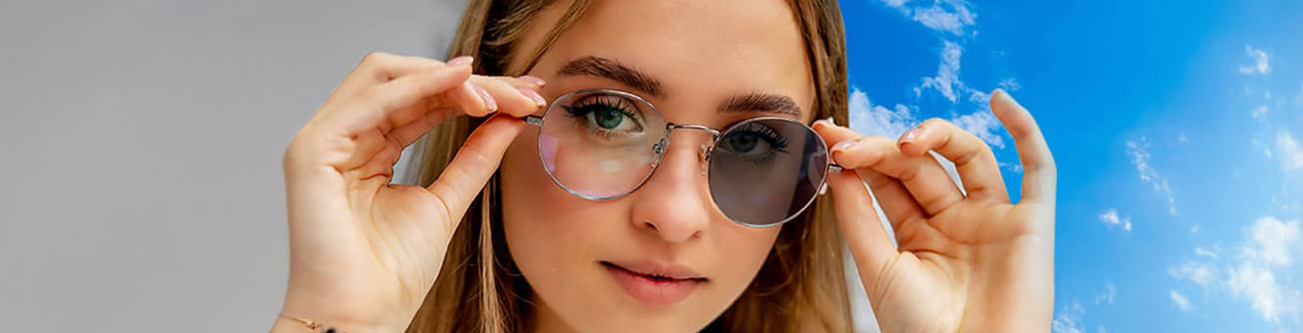 Transition lenses (photochromic lenses) automatically adjust from clear indoors to darkened sunglasses outdoors, providing effortless eye protection.