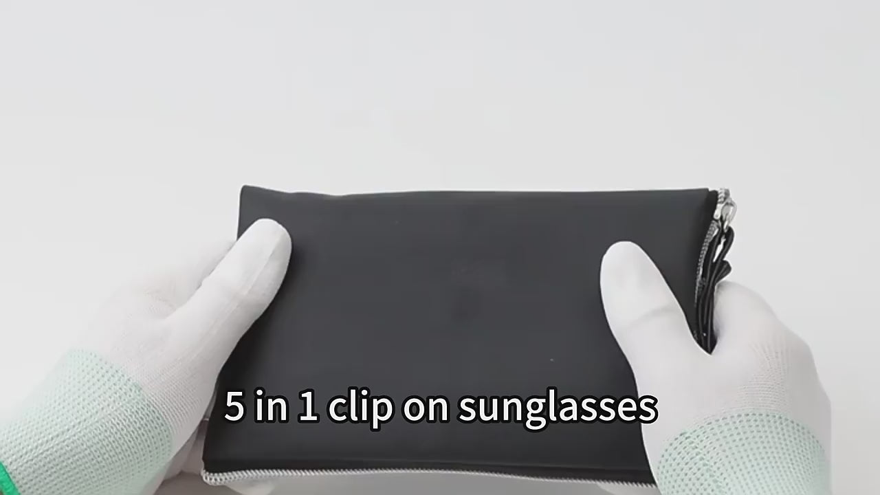 MCROONS product includes a stylish black rectangular frame with clear lenses, neatly stored in a sleek black pouch. The set features four clip-on lenses in yellow, dark gray, mirrored silver, and blue, allowing for easy customization to suit different lighting conditions and personal styles. Its durable design ensures comfort, making it ideal for everyday use or special events.