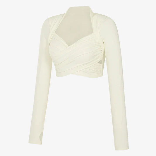 Cross-Front Long-Sleeve Yoga TopThis stylish and functional yoga top is designed to provide comfort and support during workouts.Features: Built-in Pads: Offers additional support and coverage for added confidence. Cross-Front Design: A trendy style that enhances your silhouette. Slimming Fit: Tailored to create a flattering shape while allowing freedom of movement. Long Sleeves: Provides extra coverage and warmth, perfect for cooler workouts. Versatile Use: Ideal for yoga, Pilates, and other fitness activities.